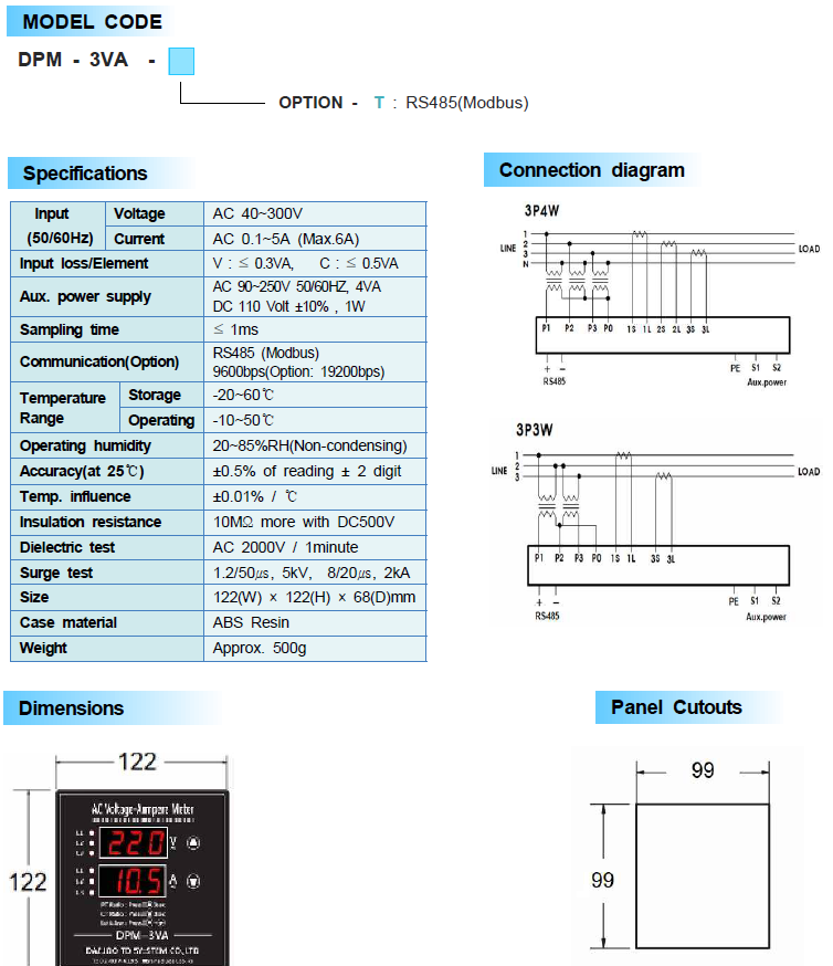 ● 전압은 PT 없이 AC 300V까지 가능하며 전류는 CT 2차측 AC 5A까지 입력 가능합니다